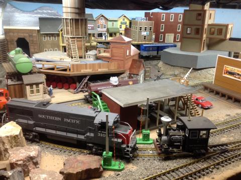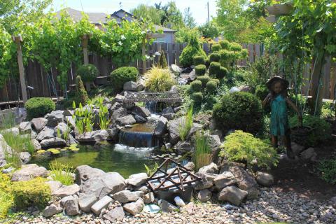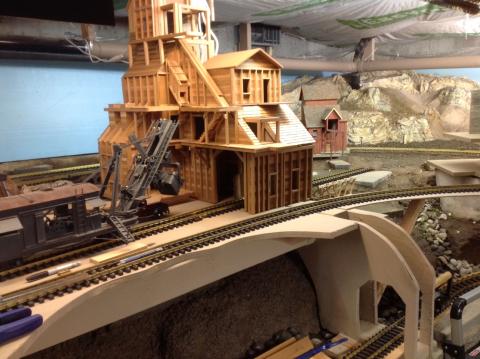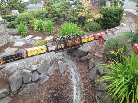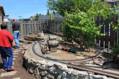 This large scale pike of over 1200' track begins in a landscaped front yard with a waterfall and miniature trees. The line circles entirely around the home through mountains, by ponds, along cedar fences and under a real vineyard before entering the basement. Multiple types of construction methods for large scale railroads are visible on this railroad which has been under development for about five years. The excavated basement has been lined with stone block and valence lighted. Scenery techniques include extruded cast foam as well as natural rock. Many scratch built and kit-bashed structures are in place along the line. The outdoor portion is viewable from sidewalks, garden path and covered porches.